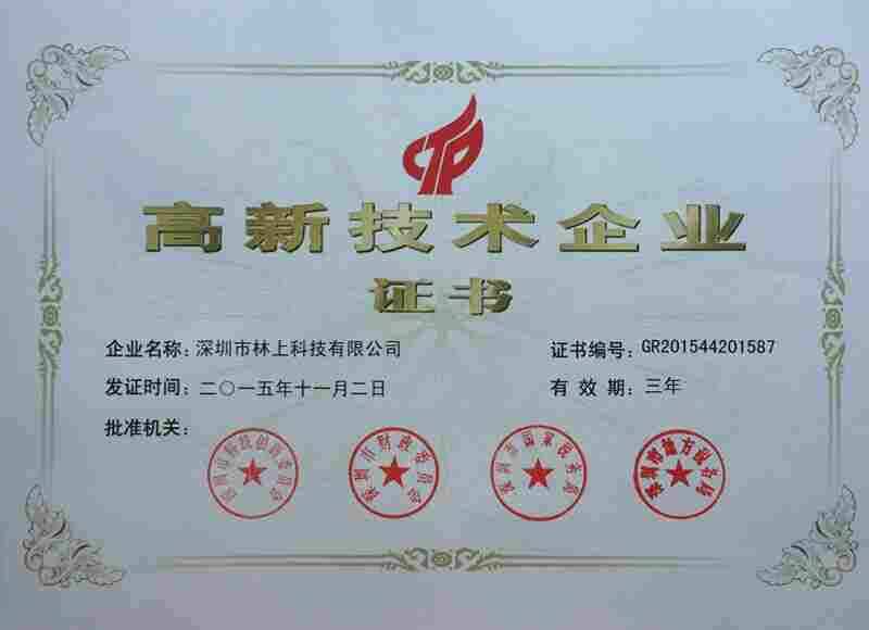 2015年12月,深圳市林上科技有限公司荣获《高新技术企业证书》,这一荣誉代表了对林上人七年来默默耕耘的奖励和肯定。
