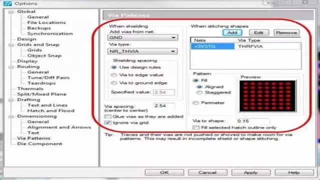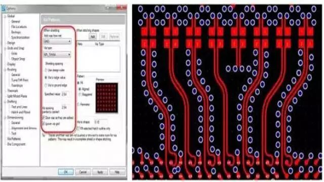射频设计的另一个重要方面是确保正确地屏蔽带过孔的区域。尽管此任务可由设计人员手动进行,但这个过程极其耗时。如果PCB 设计工具能够自动完成此过程,将可以缩短设计周期时间并确保符合您的所有设计规则。利用此类工具,设计人员可以过孔模式生成规则,而将剩余的工作全部 交由PCB 设计工具完成。