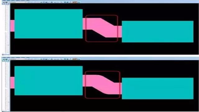 设计用于射频和微波的铜皮形状时,一个很重要的方面是能够创建带尖拐角的Gerber 文件。的PCB设计工具可以简化这一过程。例如,使用50 毫米线条绘制形状与使用50 毫米圆形光圈绘图相比,往往令设计具有较小的半径。设计工具在创建Gerber 文件时,可通过正确地自动转换线条宽度来获得尖拐角(图2)。