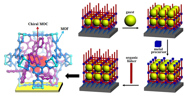 福建物构所结构化学重点实验室张健研究员和张磊研究员领导的无机合成化学团队与德国卡尔斯鲁厄理工学(Karlsruhe Institute of Technology)Christof W ll课题组合作,在科技部973计划、基金委“无机-有机杂化功能材料”创新群体、中科“新兴与交叉领域”项目和杰出青年基金资助下,采用液相外延生长法将手性纳米团簇分子(手性钛氧团和稀土配合物)负载到MOF(HKUST-1)薄膜的孔道中。该方法能够非常高效地将纳米团簇分子有序排列在MOF孔道结构中,并且能够按功能导向负载目标团簇分子,所获得的团簇负载型MOF薄膜材料整体呈现出客体分子的功能(光致发光)或者主客体复合功能(尺寸选择性手性识别)。这种液相外延生长法不仅能够将具有特殊功能的纳米团簇有效地负载到多孔MOF中形成复合功能薄膜材料,而且发展了从合成纳米颗粒拓展到合成有序的亚晶(Metacrystal)或者晶态原子级别颗粒的方法。