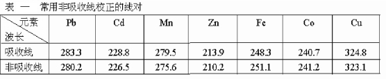 2.3.2利用非吸收线校正法,用与吸收线相距仅仅几毫微米的非吸收线测定背景吸收值.用吸收线测得的是原子吸收与背景吸收的和,进行相减之后则可校正背景吸收.常用的非吸收线见表一: