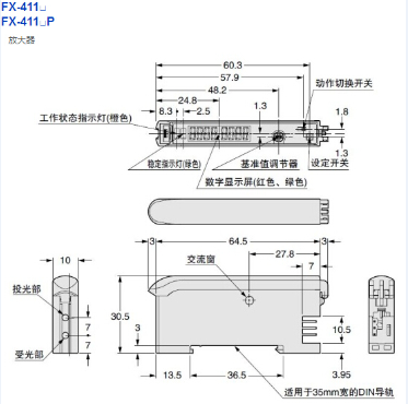 松下/ Panasonic FX-411传感器数字光纤放大器 :松下/ Panasonic 型号:FX-411传感器 数字光纤放大器 电源电压:12~24V DC±10% 脉动P-P10%以下 消耗功率:通常时:960mW以下(电源电压24V时,消耗电流40mA以下) ECO模式时:840mW以下(电源电压24V时,消耗电流35mA以下)