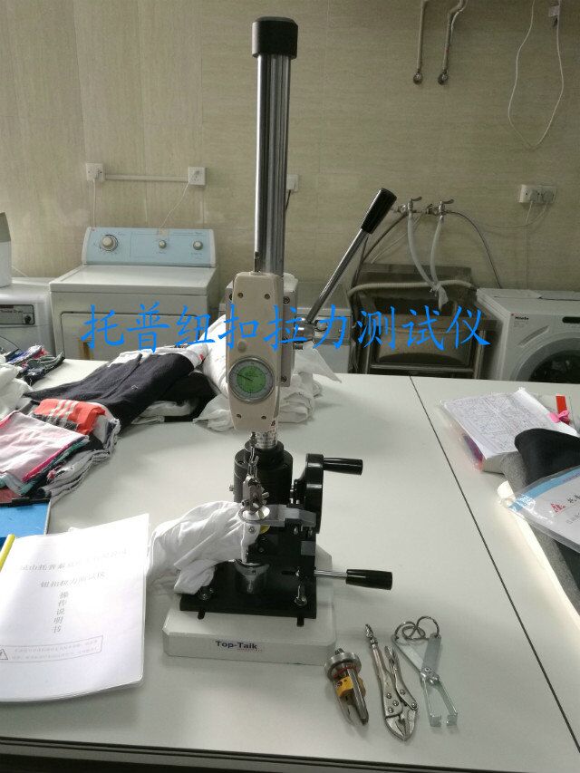 意义及作用:1.此仪器的测试方法用作量度对钮扣及衣物进行垂直拉力测试的力度,而钮扣及按钮并不拉扯至脱离衣物。2.此方法所要求钮扣缝纫规格应该按照钮扣制造商所定的标准。3.此测试方法用于建立不同穿着环境的关连性,以及对不同钮的各类和作出比较。4.此标准可能包含危险物料,操作及仪器,而标准内没有列出所有可能在使用上出现的安全问题。故此准的使用者责任建立有关的安全和建康的规则,以及在使用前决定适当的规条。5.所有钮扣都需要用锁链针步缝紧在布料上。6.按照测试要求,当大的钮扣尺寸是大于6mm或小于/等于6mm,钮扣就改须能分别承受90N有50N的拉力。