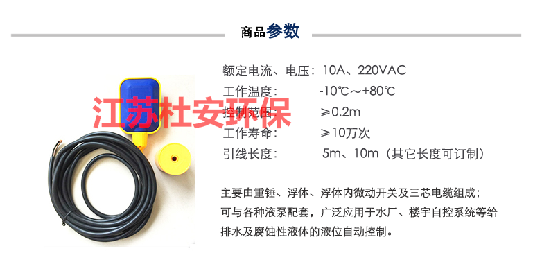 一、 杜安环保设备(江苏)有限公司公司荣誉出品,FK-2电缆浮球开关,是利用重力和浮力的原理设计而成,结构简单合理。主要包括浮漂体,设计在浮漂体内的大容量微动开关和能将开关处于通、断状态的驱动机构,以及与开关相连的二芯电缆、重锤、防水圈。 该产品显著的特点是性能稳定可靠(不因液面的波动而引起误动作),同时它还具有无毒、抗腐蚀、安装方便、价格低廉、使用寿命长等特点。 该产品可与任何液泵配套,广泛用于污水处理、给水、排水及含腐蚀性液体的液位自动控制。