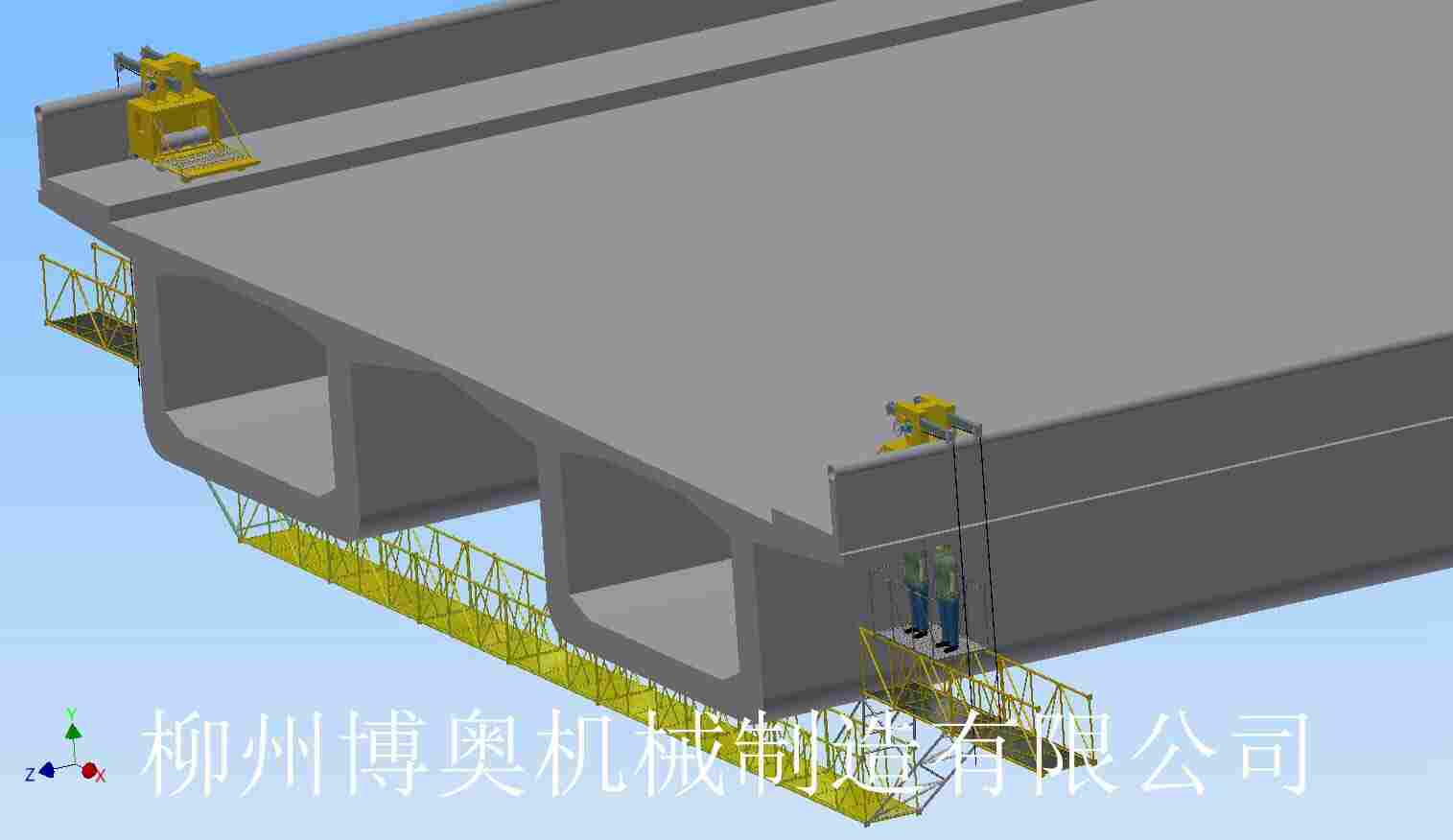 博奥*桥梁检测车的用途是:高速公路桥梁更换检修橡胶支座的设备,用于桥梁梁板下提升悬挂操作平台以及进行操作平台的水平行走。单台设备可垂直起重1000kg的重物—〈操作平台〉。在电动作用下携带重物可做水平滑动行走。并且它在河面上不能搭建脚手架或桥墩较高不易搭建脚手架的情况下发挥了不可替代的作用;同时在桥梁上施工时无需交通管制,不影响车辆通行能力,广泛应用于各种道路桥梁和城市立交桥梁的维护领域。