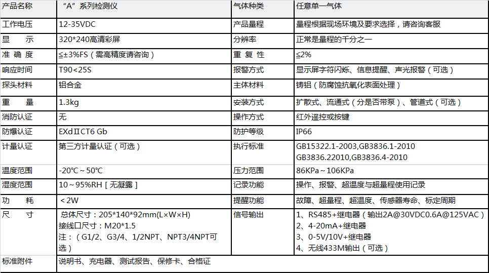 “A”系列检测仪是公司代产品的延续,是斯柯森走向市场的排头兵。检测仪同时具有实时数据显示、检测浓度信号变送等功能。“A”系列检测仪内部带有1个继电器(开关量信号),可以控制声光报警器、风机、电磁阀等外部设备。输出的标准信号(如电压信号(如0-5/10V)、电流信号(如4-20mA)、标准数字信号(如总线RS-485、RS232)、频率信号、Hart协议信号,变送到PLC、DCS、报警控制主机等上位机后进行统一显示、管理和控制。