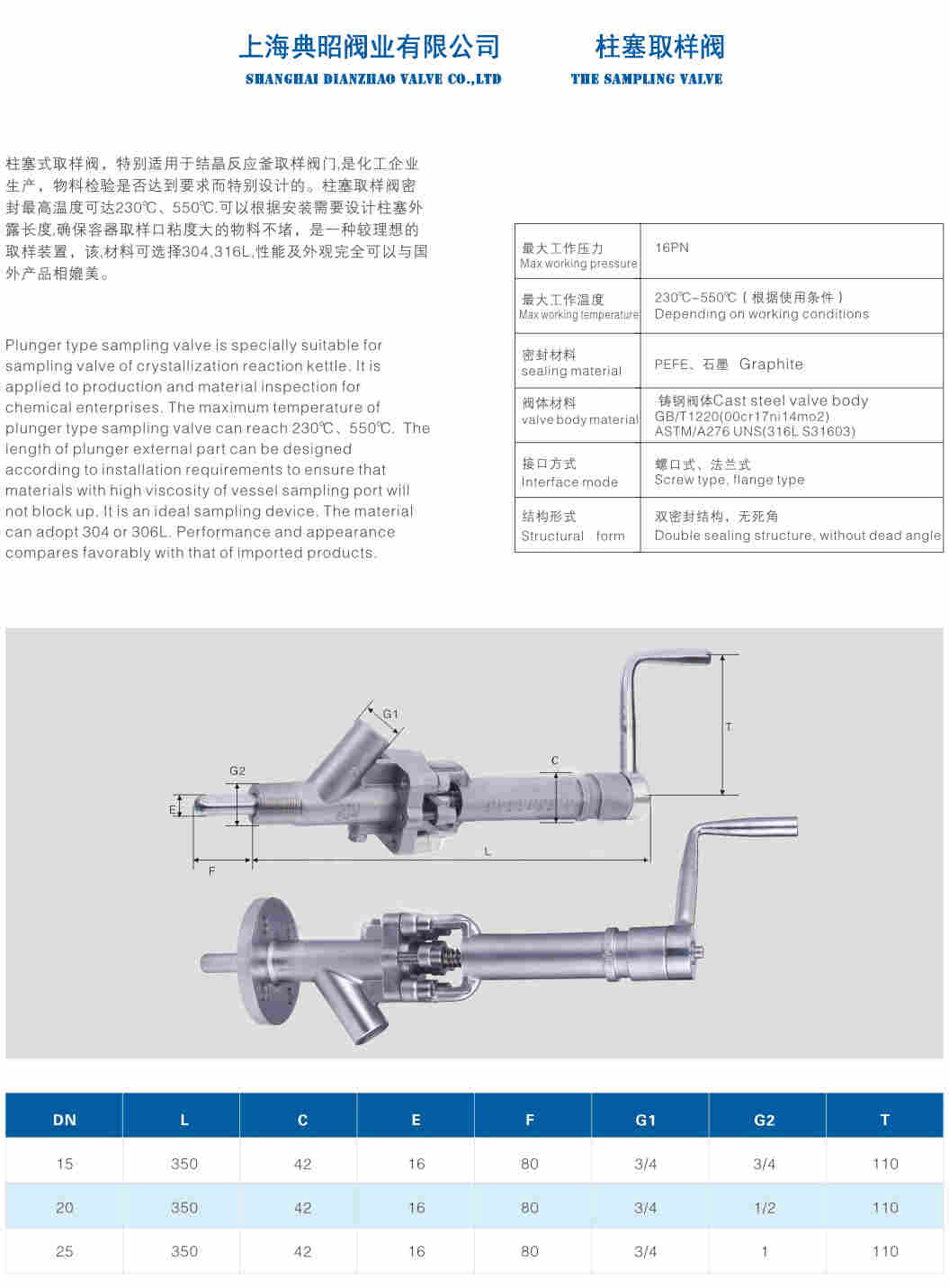 柱塞式取样阀上海典昭阀业有限公司的柱塞式法兰取样阀生产厂家,本公司生产的柱塞式取样阀分为螺纹,法兰,焊接。