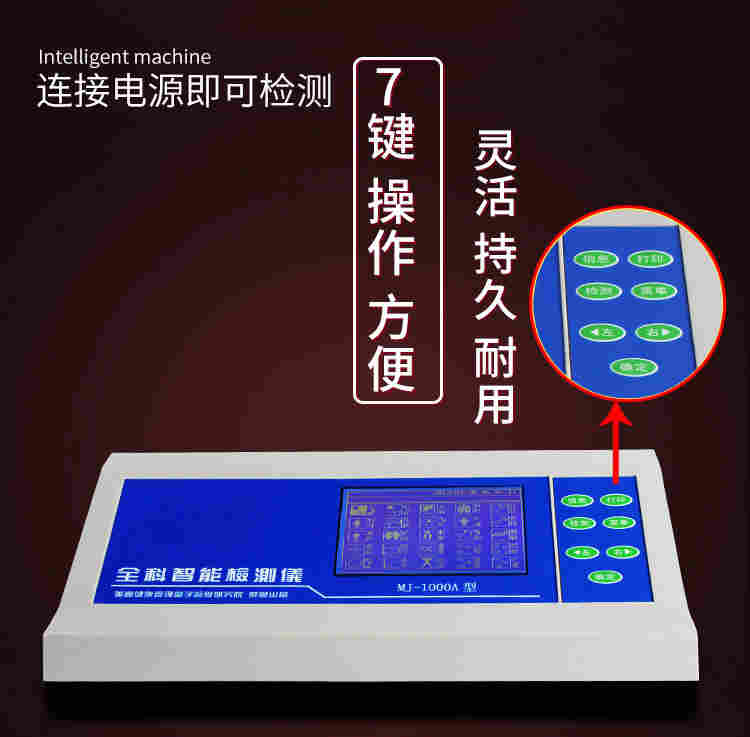 全科智能检测仪特点:屏幕采用320*240液晶屏,无需连接电脑,配有密码箱便于携带,自带液晶显示屏,自动检测报告,自带打印功能,实用性更强,准确率更高,检测范围广泛,快捷,安全,无副作用,可以一次多测或者一次一测,更加人性化。
