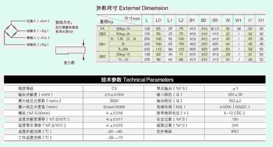 安徽智敏电气技术有限公司厂家直销悬臂梁型压力称重传感器,高精度、高可靠性、稳定性好,安全简便,安装台面低。广泛应用于平台秤,轴载秤,汽车检测线,汽车衡,料斗秤,罐秤,液压搬运秤,自动钢筋折弯机,自动筛选秤等。 详细介绍 精度等级:C3 输出灵敏度:2.0 蠕变:≤±0.016 温度灵敏度漂移:≤±0.011 温度零点漂移: ≤±0.015 温度补偿范围:-20∽+60 工作温度范围:-35∽+70 零点输出:±1 输入阻抗:380±20 输出阻抗:352±2 使用电压:5∽12(DC) 安全过载:120% 极限过载:150% 防护等级IP67 材质 合金钢或不锈钢 接线方式 输入(+):红线, 输入(-):黑线,输出(+):绿线,输出(-):白线