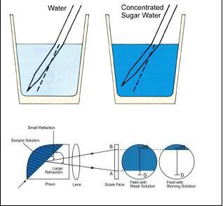 折光仪(折射仪)基于溶液的折光率比例于浓度的原理而设计的糖量折光仪可以用来直接测定含糖溶液的含糖量。只要在检测棱镜的镜面上放入2-3滴试液就可以。糖量折光仪用于快速测定含糖溶液的溶度、果酒密度;通过换算还可以测量其它非糖溶度或折射率,是制糖、食品、饮料、酿酒、农业科研、纺织及矿山机械等行业必不可少的检测仪器。我生产的折光仪系列产品外表美观,精度准确,经久耐用,品种齐全,价格适中。折射计折光的理论如果你放置一杯水的一支铅笔,顶端将会显得弯曲的. 然后如果你在一个杯子中放置糖水并且试相同的实验,铅笔的顶端应该显得甚至更弯曲的. 这折光率现象的一个例子.折射计由于采用的光学系统放到一种实际的使用. 通过溶液的折射率与其溶度的对应关系的换算来测量试液的溶度.当物质的密度增加(举例来说. 当糖在水被溶解的时候物质的溶度增加),它的折射率引相称地升高.1.折射计利用棱镜持有比试液较高的折射率理论;通过换算来测量试液的溶度或折射率.2. 在试液比较弱的情况时,试液的折射率比棱镜的高, 因此折射的角度是比较大的的 ( 看A.在下面的图表上).3. 在试液比较强的情况时,试液的折射率比棱镜的低, 因此折射的角度是比较小的 ( 看B.在下面的图表上). |