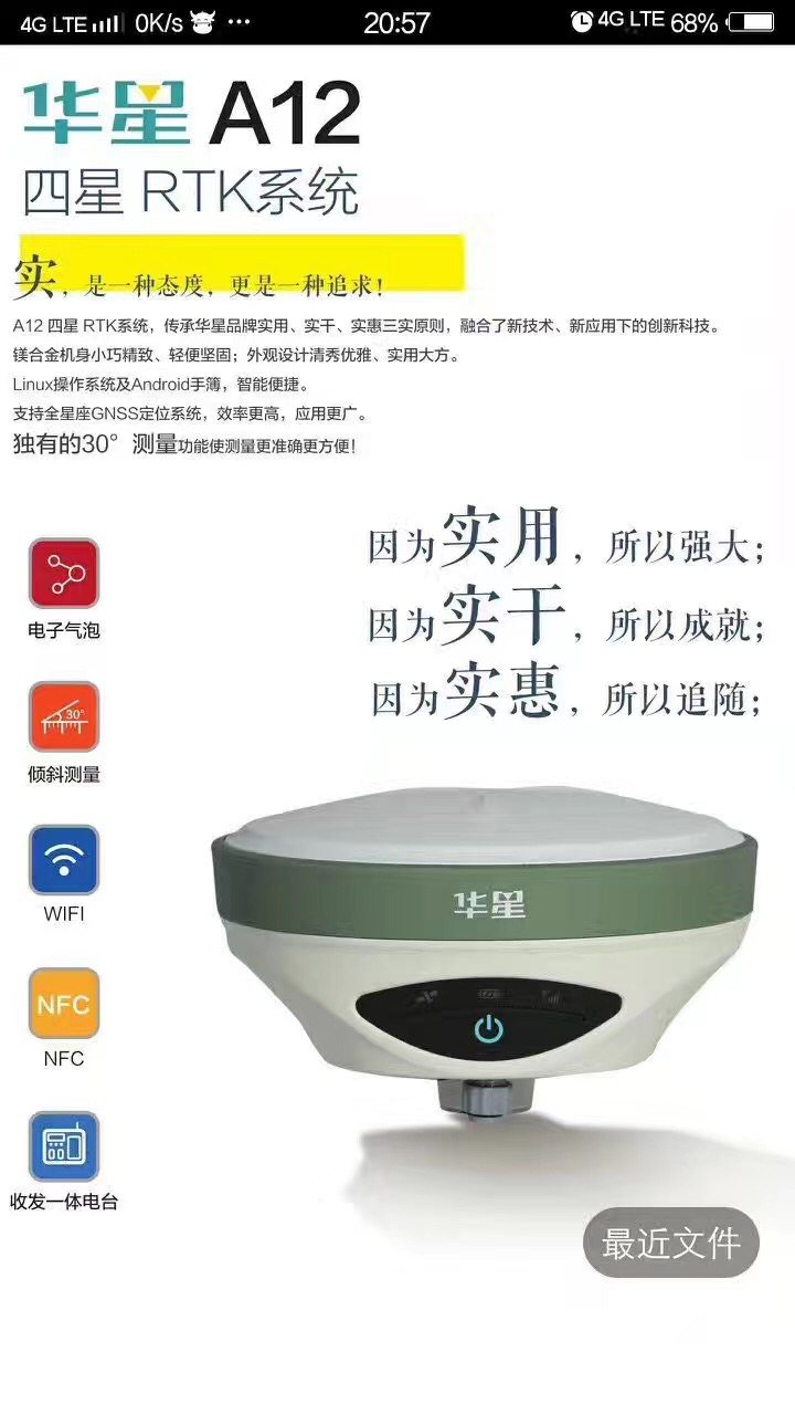 华星A12 GNSS RTK系统是华星推出的高配置产品,在实惠的基础上注入更多的科技成果,性能更优、功能更广、实用性更佳。 1、全新外观设计,镁合金结构,体积更小,重量更轻; 2、Linux操作系统,功能更强大; 3、内置收发一体化电台,作业选择更加多元化; 4、8G内置存储空间,可支持32GSD卡; 5、支持WiFi及远距离蓝牙连接 6、新一代全强固型智能Android手簿,坚固、灵巧、续航能力强; 7、新一代Hi-Survey测量软件,充分满足各行业用户需求,更加实用。 8、支持倾斜测量,不需要对中,便可得到正确的坐标。 9、电子气泡技术,完成智能对中 相关配件 iHand20全强固手簿 >3G通信/双卡双待:可通话功能 iHand20全强固智能手簿——Android数据采集器! 采用全新的材料外壳,意向不到的触感享受,人性化的设计理念,全键盘+触屏的设计可随意选择输入模式! 高端的系统配置 >操作系统:Android4.2系统 >处理器:1.5G4核处理器 >内存:1G内存,4G闪存 >显示:3.7英寸高亮级户外彩色触摸屏,多点电容式触摸 >全数字、字母键和快捷键、导航键,支持用户自定义快捷键 GPS特性: >内置高灵敏度抗干扰GPS天线,20通道GPS >支持SBAS(WAAS,EGNOS,MSAS) >更新率:1Hz >首次定位时间:30秒(典型) >单点定位:5米 >SBAS:1-3米 电源性能 >内置3.7V锂电池,6300毫安时,可方便拆卸,支持在线充电 >单块电池可连续工作25小时 应用功能 >内置800万像素自动对焦摄像头,具备影像标注功能 >内置麦克风,具备语音标注功能 >重力传感器、电子罗盘、气压计、距离传感器、光感应器、三轴陀螺仪 物理性能 >尺寸:213mm×89mm×35mm >重量:520g(含电池) >防尘防水:IP68 >防震:抗1.2米自由跌落 >工作温度:-20℃~+55℃ >存储温度:-30℃~+65℃ 智能体验 >一键启动作业 >自动回复模式 >一键安全测量 >自动取中技术 >智能语音播报 >二维码参数分享 丰富应用 >RTK、PPK(后处理动态测量)、静态测量模式 >碎步测量、点、线放样、图根控制测量 >具有移动GIS坐标+属性的自动匹配采样 >海量遥感影像与矢量数据的叠加展示 >数据字典支持、自定义数据采集 >dxf底图直接加载 >软件、固件自动升级 >产品信息实时推送 >实时在线图文信息上报求助服务