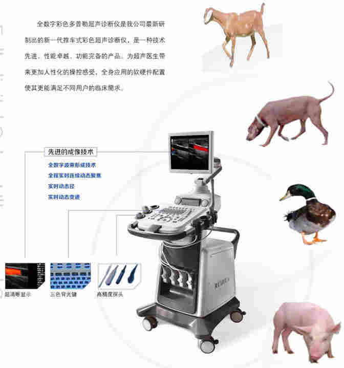 适用于对动物的腹部(肝、胆、肾、胰、脾)、心脏、甲状腺、小器官、泌尿科、浅表、矫形外科诊断与分析。可对肝、胆、脾、肾、劲动脉等大血管部们进行功率诊断。 |