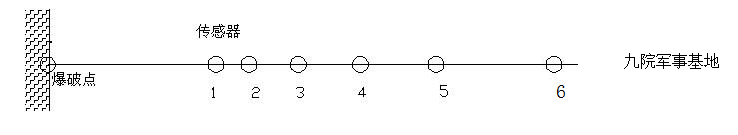 爆破试验应安排在老龙山隧道进口正常施工前,分别以爆心为起点,过九军事基地的延长线上,以近密远疏的方式布置6个三矢量速度传感器(各监测点与点宜在同一高程),若现场条件允许,在保证设备安全的前提下,各测点与作业点的距离可设定为10 m、40 m、80 m、160 m、320m、400m或根据现场场地条件调整。而传感器的布置见图2: