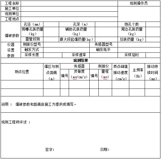 现场监测必须做好监测记录,将收集到的爆破参数及拾振器和记录仪的型号、灵敏度、编号、测点号、对应位置等数据制成表格,记录表格格式见下表《爆破振动检测原始记录表》。