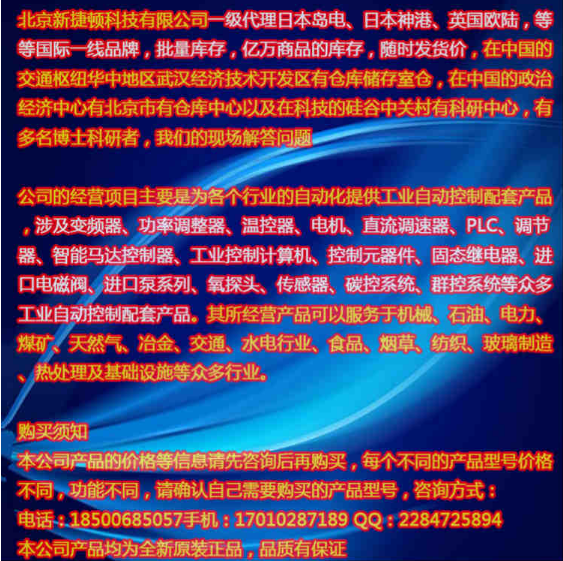 本公司主要产品有电力调整器 , 可控硅调功器、调压器、希曼顿固态继电器、神港固态继电器,固态调功器,调节仪 , 温度传感器 ,低压变压器 可控硅模块 , 氧探头 , 并一级代理 SHIMADEN岛电 ,SHINKO神港 , 富士 ,RKC理化仪表, EUROTHREM欧陆 ,AEG, 马拉松 ,SSI 美国米顿罗 帕斯菲达 MAC电磁阀 安川、三菱、ABB伺服变频器 等国际公司的产品