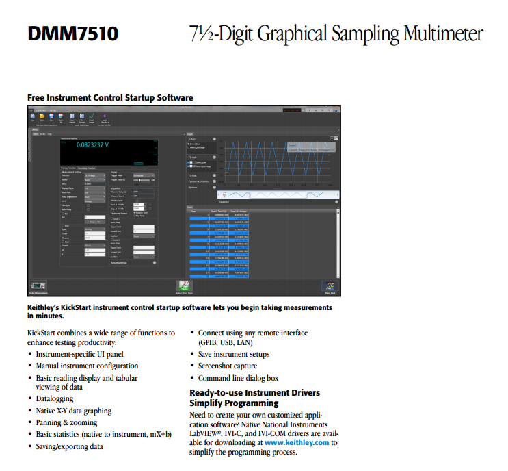 Keithley 的 7½ 和 8½ 位高分辨率万用表可提供的测量精度和灵敏度。我们的新款 DMM7510 图形采样万用表是同类产品中数字万用表,它将数字万用表与 5 英寸图形触摸屏和高速高分辨率数字化器结合在一起,可捕获波形和瞬态信号,不只是向您提供数字。