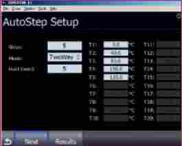 多可以设定20 步自动步进,包括每一步的保持时间.完成一个自动步进过程以后,用户可以方便的读出被检探头的读数.多可以存储20组自动步进测试数据.用户可以通过温度设定功能设置目标温度(分辨率0.01)