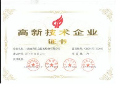 近日,上海赛印信息技术股份有限公司喜迎佳音,我司凭借企业资质、科技研发实力等条件,荣获由上海市科学技术委员会、上海市财政局、上海市税务局、上海市地方税务局联合颁发的《高新技术企业证书》,由此正式迈入高新技术企业行列。