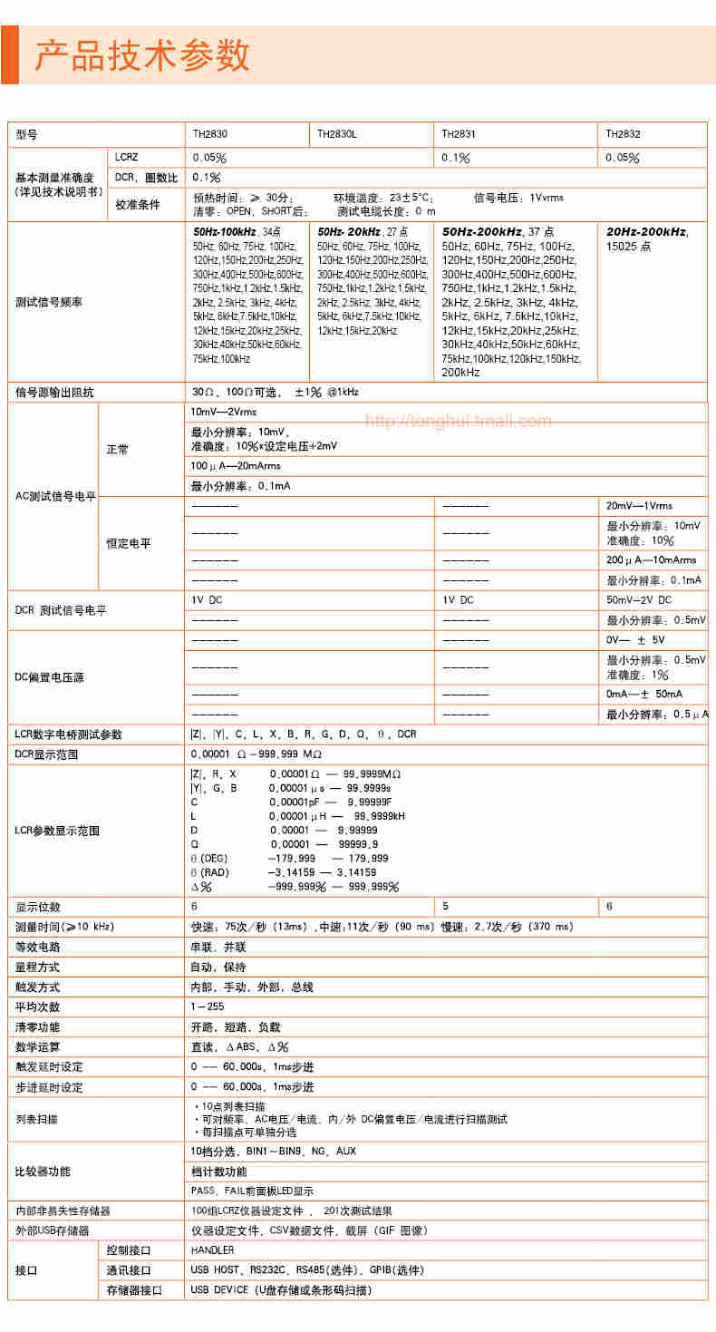 TH283X系列是新一代低成本,高性能紧凑型LCR数字电桥,采用新工艺和高密度电路设计,浓缩大型LCR测试仪的精华,紧凑,小巧.取消传统机械电源开关,采用软件控制电源开关.0.05%的基本精度和良好的测试稳定性可与高端机型媲美.配备4.3寸LCD显示屏和全新升级的界面系统.美观大方,操作简便.仪器提供丰富的接口,兼容标准SCPI指令,可方便地组成各种测试系统,满足检验,生产,科研的各种需求.