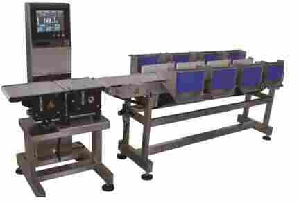 当产品从输送带经过海鲜重量分级机秤台时,产品在秤台上称重传感器会动态监测出产品的重量,并把产品的重量传输给海鲜重量分级机的控制系统,由系统判断该产 品一个重量范围内。海鲜重量分级机的控制系统给出该物品的类别,并将数据传输给分选机构,由分选机构进行相应的分选。