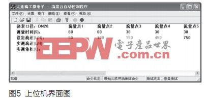 上位机软件采用MFC(微软的基础类库)的编程方法,充分利用了面向对象技术的优点,MFC类库中各种对象的强大功能足以完成程序中大部分所需要的功能。软件操作界面如图5所示。通过界面中的设置选项可以设定的流量点个数、流量点流速和不同流量点的具体时间。