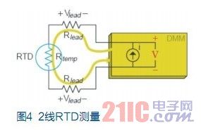 与热敏电阻相似,铂电阻温度传感器(RTD)也是用铂制成的热敏感电阻。当通过测量电压计算RTD温度时,数字万用表用已知电流源测量该电流源所产生的电压。这一电压为两条引线(Vlead)上的压降加RTD上的电压(Vtemp)。例如,常用RTD的电阻为100Ω,每1℃仅产生0.385Ω的电阻变化。如果每条引线有10Ω电阻,就将造成26℃的测量误差,这是不可接受的。所以应对RTD作4线欧姆测量。