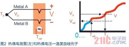 热电偶是温度测量中常用的传感器。其主要好处是宽温度范围和适应各种大气环境,而且结实、价低,无需供电,尤其便宜。热电偶由在一端连接的两条不同金属线(金属A和金属B)构成,如图1所示。当热电偶一端受热时,热电偶电路中就有电势差。可用测量的电势差来计算温度。