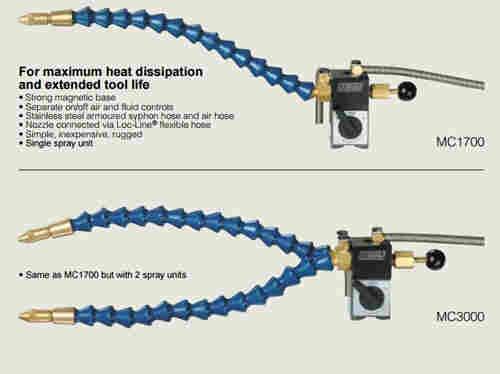NOGA Minicool is using the VENTURI principle to spray an air + liquid mixture. The Minicool enables the user to easily control both the air flow rate and liquid rate.