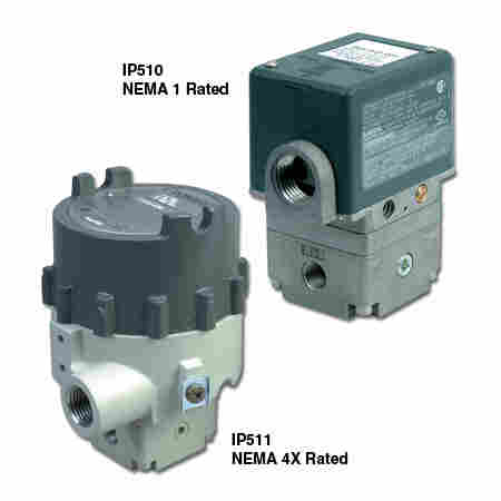 The IP510/EP510 Series are a patented family of electro-pneumatic instruments that are used to reduce a pneumatic supply pressure to a regulated output pressure which is directly proportional to a two-wire current or three-wire voltage input. This design incorporates closed loop sensing of the output pressure to achieve excellent accuracy and vibration stability. They also feature a unique damping circuit which can be adjusted to prevent overshoot and actuator hunting. Model selection includes General purpose NEMA 1, and Water-tight/Corrosion Resistant NEMA 4X (IP65). All models carry Hazardous Locations and intrinsically safe ratings.
