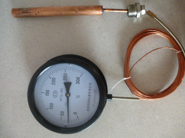 压力式温度计的原理是基于密闭测温系统内蒸发液体的饱和蒸气压力和温度之间的变化关系,而进行温度测量的。当温包感受到温度变化时,密闭系统内饱和蒸气产生相应的压力,引起弹性元件曲率的变化,使其自由端产生位移,再由齿轮放大机构把位移变为指示值,这种温度计具有温包体积小,反应速度快、灵敏度高、读数直观等特点,几乎集合了玻璃棒温度计、双金属温度计、气体压力温度计的所有优点,它可以制造成防震、防腐型,并且可以实现远传触点信号、热电阻信号、 0-10mA或4-20mA信号。是目前使用范围广、性能全面的一种机械式测温仪表。