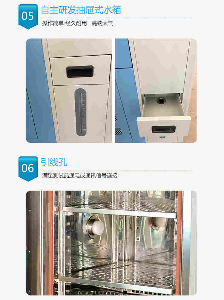 高低温湿热试验箱加湿系统管路与控制线路板分开,可避免因加湿管路漏水发生故障,提高安全性。