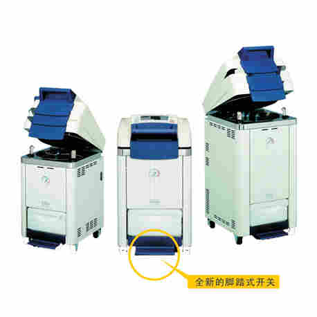 1.轻轻地向下按TOMY高压灭菌锅盖的把手,脚踏盖锁解 除踏板。