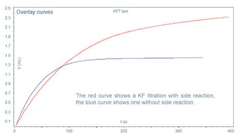 红色曲线表示有副反应发生时的KF滴定曲线。在水分滴定结束后,曲线仍有持续的略微上升趋势,副反应的发生导致滴定剂的持续消耗,产生不准确的结果。