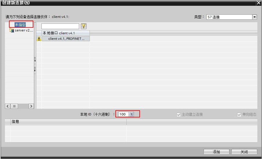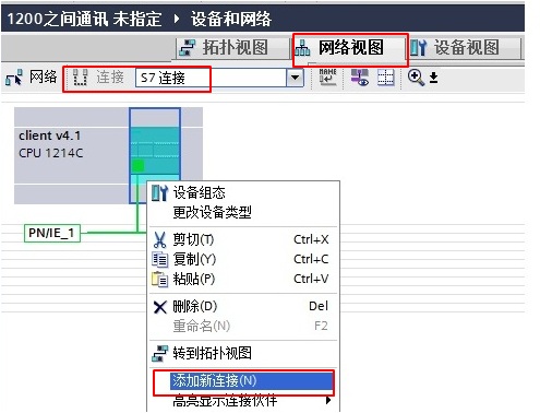 在“设备组态”中 ,选择“网络视图”栏进行配置网络,点中左上角的“连接”图标,连接框中选择“S7连接”,然后选中client v4.1 CPU(客户端),右键选择“添加新的连接”,在创建新连接对话框内,选择连接对象“未”,如图 10 所示。