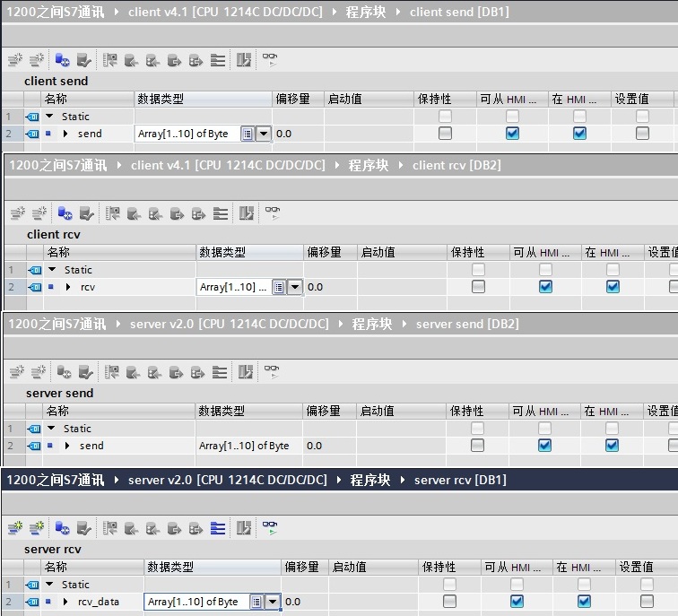 在 S7-1200 两侧,分别创建发送和接收数据块 DB1 和 DB2,定义成 10 个字节的数组,如图 6 所示。