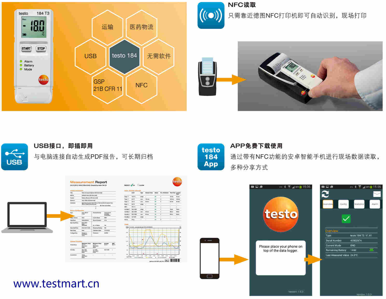testo 184 USB型温度记录仪采用防篡改的专有格式,保证了极高的测量数据安全性和真实性。通过自带的USB接口,记录仪可以连接到PC上进行数据的读取,或者通过手机NFC功能读取数据, 尤其是在运输结束时,可使用NFC打印机快速打印冷链过程数据,简化在货物交接过程中的一系列繁琐流程。
