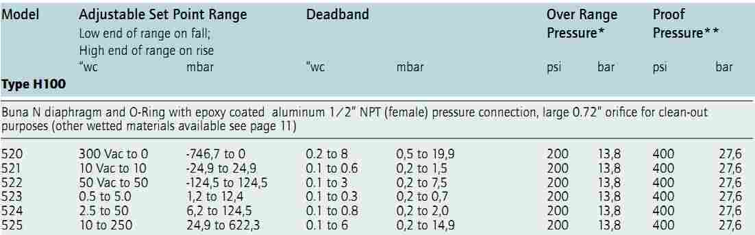 可调设定范围:-24.9-24.9mbar,死区0.2-1.5mbar,H100-521此型号的感压膜片的材质是丁晴橡胶,加可选项XC004将膜片材质和压力接口变为不锈钢,耐压400psi,单电设定可调炉膛负压开关。