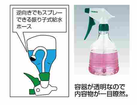 オモリの付いた給水ホースが傾けた方向に動くので、どんな角度からでもスプレー可能です。