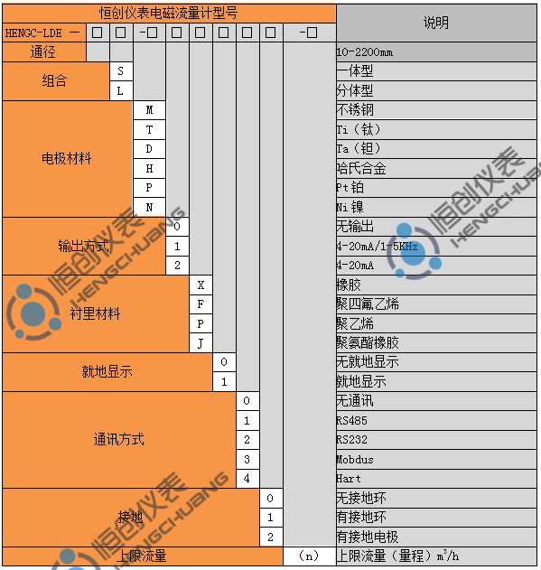 矿浆流量表如何对照选型代码来编辑呢?例如本文章阐述的是关于水煤浆计量该如何选型,围绕它的性质,我们得知它并没有腐蚀性,编辑代码如:HENGC-LDE-50S-M2X101-15,它的代码含义为一体型电磁流量计,DN50,不锈钢材质,橡胶衬里,4-20mA输出,就地显示,无通讯方式,有接地环,实际上限流量是15m3/h。