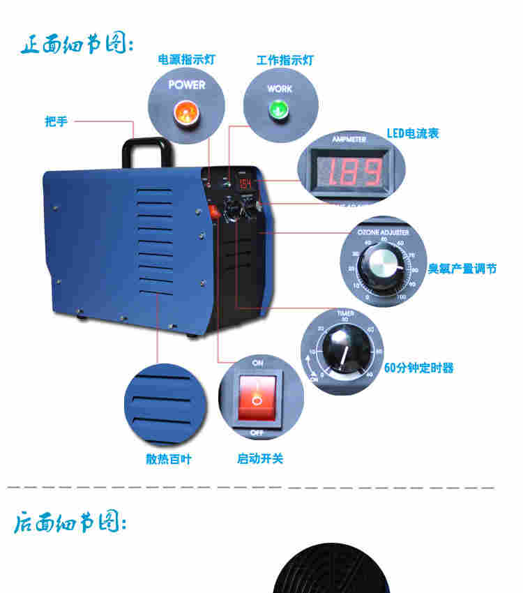 6.臭氧浓度可调节20%-,人性化双向定时器0-60分钟或持续工作。