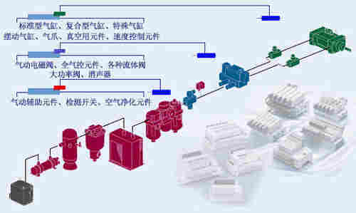 一个典型的SMC气动系统是由方向控制阀、气动执行元件、各种气动辅助元件及气源净化元件所组成。