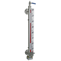 磁翻柱液位计根据浮力原理和磁性耦合作用研制而成。当被测容器中的液位升降时,液位计主导管中的浮子也随之升降,浮子内的磁钢通过磁耦合传递到现场指示器,驱动红、白翻柱翻转180º,当液位上升时,翻柱由白色转为红色,当液位下降时,翻柱由红色转为白色,指示器的红、白界位处为容器内介质液位的实际高度,从而实现液位的指示。