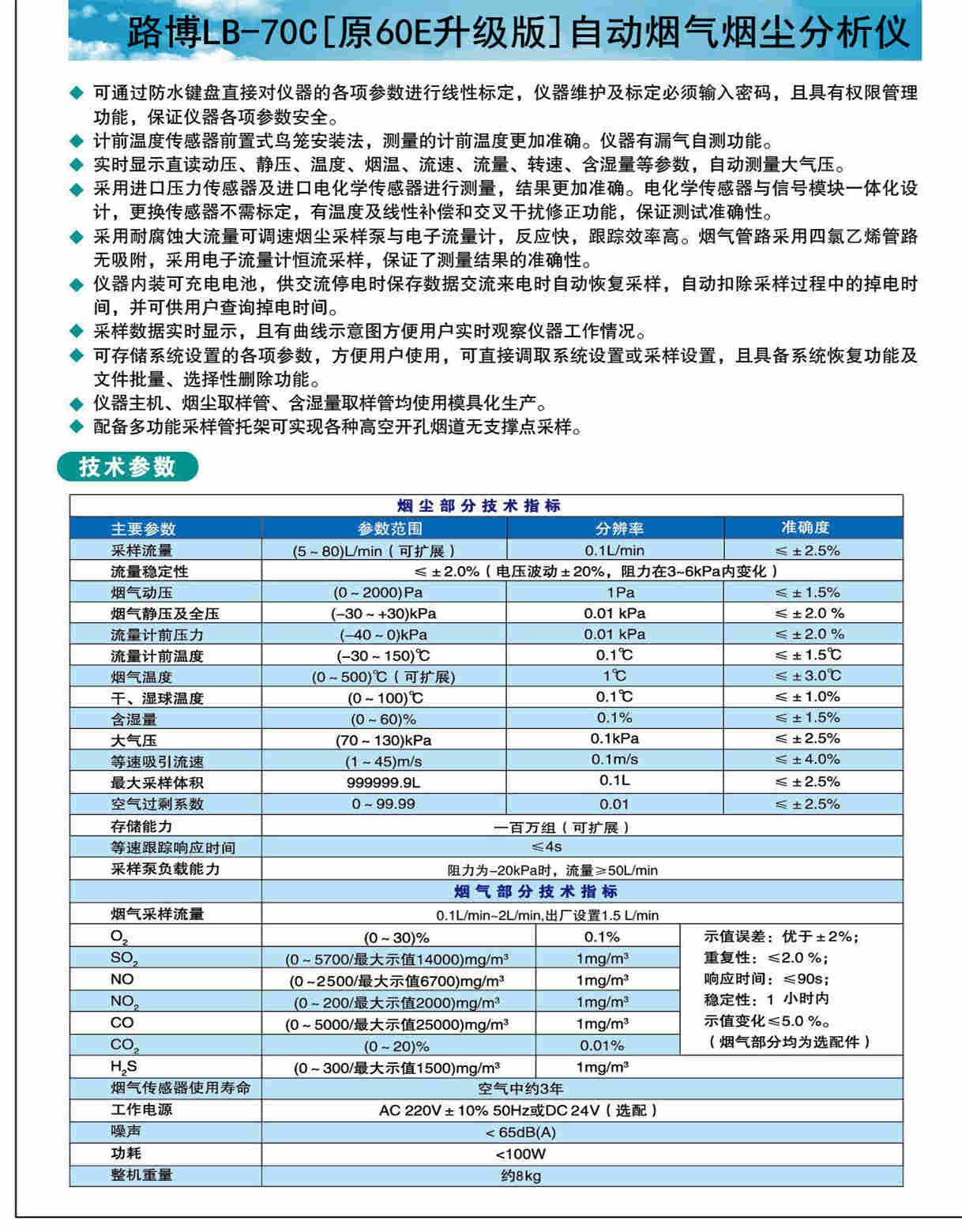 采用皮托管等速采样重量法采集烟道中的颗粒物,定位电解法测定烟道中的有害气体,干湿球法测定烟道中的含湿量。可广泛应用于环境监测、劳动保护、工业卫生、厂矿企业等部门进行管道污染源中的颗粒物采样和有害气体浓度采样,也可应用于烟气连续测量仪器准确度的评估和校准。
