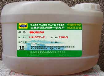 1、HH972-2稳定剂工作液的PH值的维护十分重要,PH<6或>9时,有效成份会自然析出成为微粒,外观质感会下降,起彩,所以前工序必须清洁,再浸泡工作液,防止酸性或碱性成份带入工作液,以延长稳定剂的使用寿命。