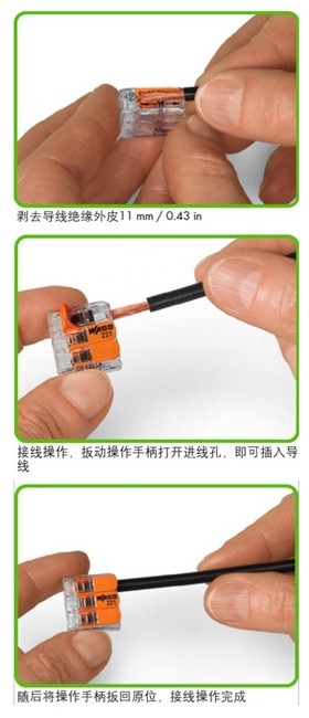以下为WAGO接线端子221系列操作示意图。