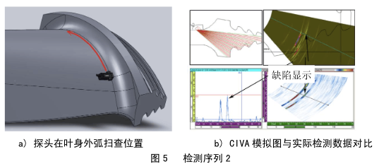 序列2:将相控阵探头1放置在叶身外弧表面,激发横波、扇形扫查检测内弧局部区域缺陷,见图5;