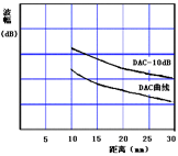 横波距离-波幅曲线应按所用探头和仪器在DL-1试块上实测的数据绘制而成,该曲线族由评定线和DAC线组成。评定线与DAC线之间相差10dB,如图5所示。