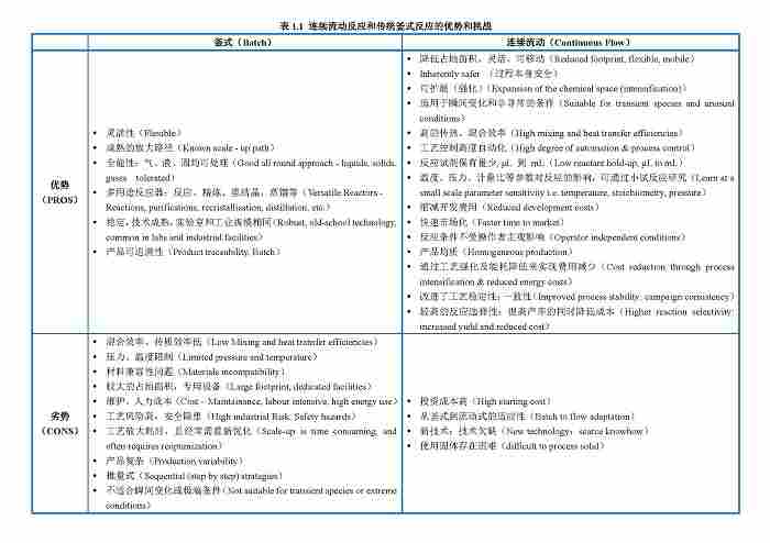 由于连续流动反应器的内部微结构特征,许多在传统釜式反应器中无法实现的反应都可以在连续流动反应器中得以实现。与传统的釜式反应相比,均有各自的优势和挑战,其区别如下表1.1所示: