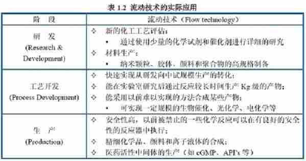 依据流动技术的优势,流动化学技术的应用领域目前主要为医药、精细化工、农业化学、特殊化学品及日用品化工业,在这些领域中的实际应用主要见下表1.2所示: