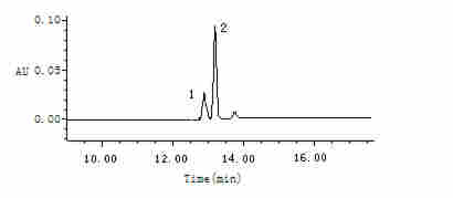 B.2经光碘异构化的叶黄素(反式)标准溶液液相色谱图(1:顺式结构的叶黄素,2:反式结构的叶黄素)